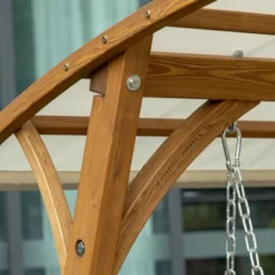 - WOODEN PATIO SWING: This swing bench is built from strong solid pine wood sealed with oil that helps it withstand water and weather without sacrificing the wood’s natural beauty.