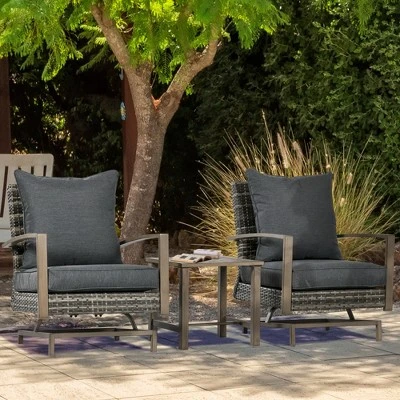This three-piece rattan patio bistro furniture set brings the comforts of your living room to your backyard. Everything is in one place: two rocking chairs and an easy-draining slatted coffee table. Enjoy the perks of home, like thick cushions and seats that rock in the great outdoors. Made of all-weather PE with handwoven charm, this set is perfect for pool parties, dinners, drinks, picnics, and backyard barbeques. Get inside out with Outsunny.
