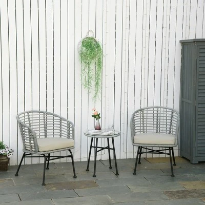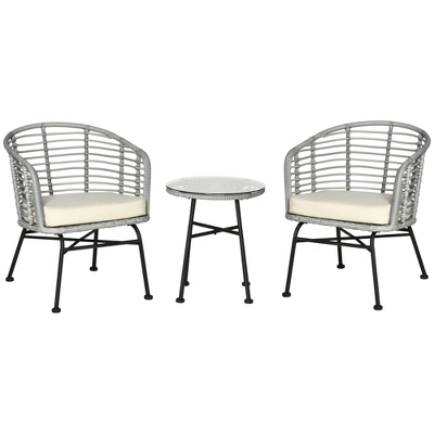 - Patio Bistro Furniture Set: Serve drinks, dinner, or play a game with guests. This three-piece bistro furniture set features two outdoor wicker chairs and a matching tempered glass table.