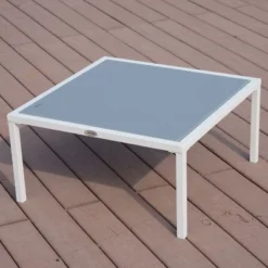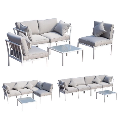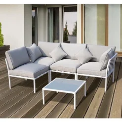 - Classic Styling: Stylish white and gray colors create an elegant look that makes this metal patio furniture set go with any setting. Clean white frames compliment the gray colored cushions and go great with the glass-topped coffee table. Together, they create a stylish and classic look in a sophisticated setting.