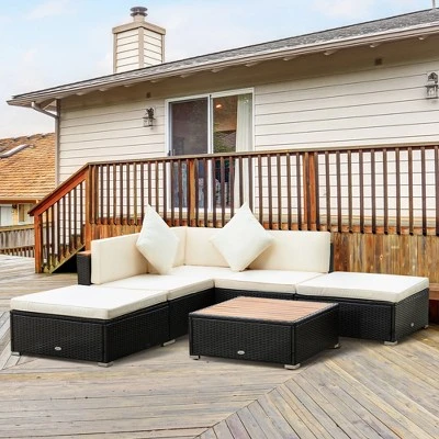 Bring indoor comfort outside. Outsunny offers a patio sectional set that gives you all the charm of wood and wicker. Cozy and customizable, you can rearrange the layout with two large ottomans, a coffee table, a couch corner, and two sofa seats. This set fits five and is fully cushioned. Create a chaise and enjoy resting your head on either of the two throw pillows. Invite over friends, eat dinner, serve drinks, or play a game outside. Get out, get comfy, get Outsunny.