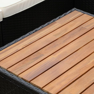 - Outdoor Furniture Set: Our wood and rattan patio furniture set has an outdoor sofa, two ottomans, and a coffee table. An excellent couch for conversation; rearrange it and seat up to five in many ways.