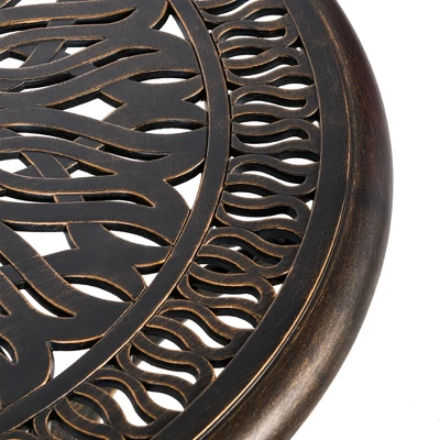 Outsunny offers you an elegant outdoor dining space. This patio furniture set is crafted out of cast aluminum. Surprisingly stackable, the chairs feature flower motifs seat, and back, with scrollwork flourishes along the armrests. Our outdoor dining table brings a burst of mandala-like branch patterns to your backyard, with the option of a matching umbrella. Lightweight to carry yet heavy-duty against rain and outdoor moisture, our cast aluminum patio furniture set allows form and function.